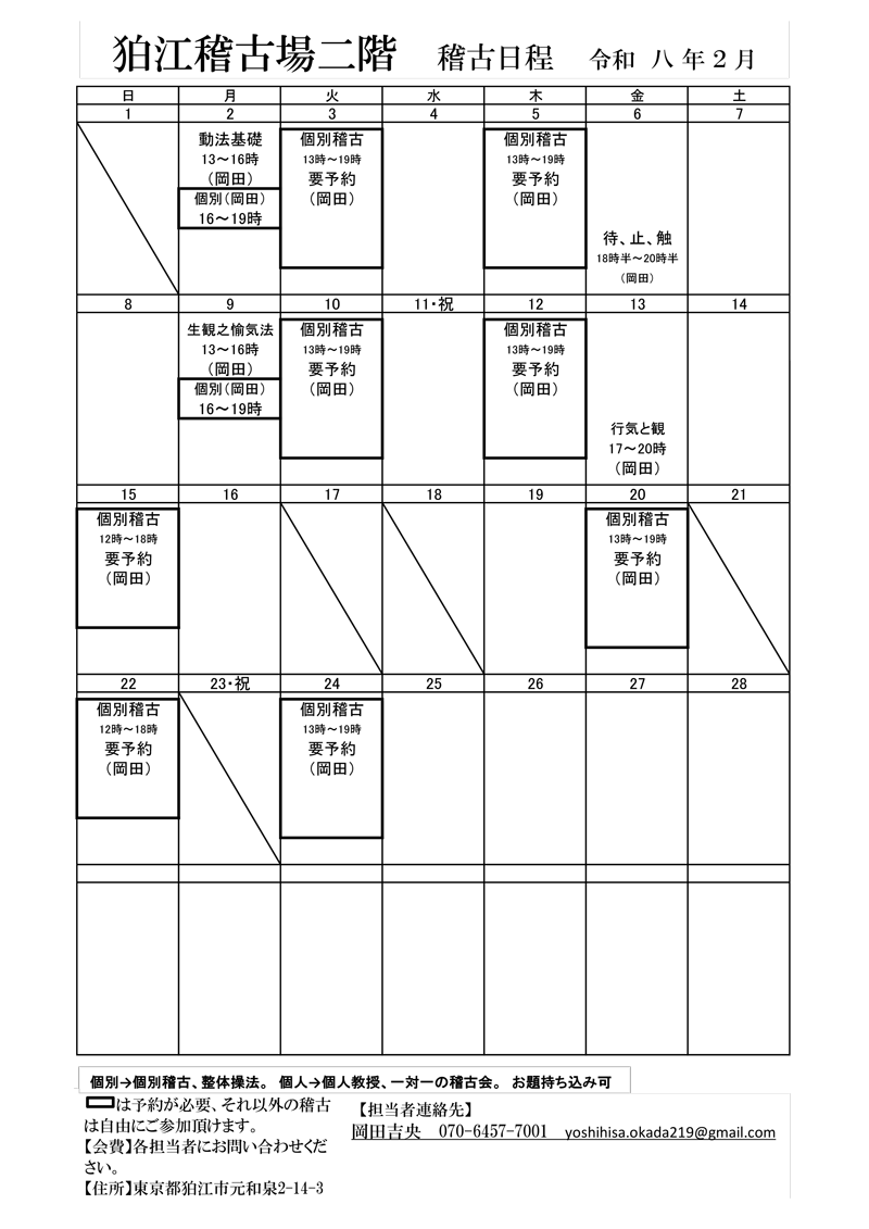 動法を軸に連座、連座基礎、集団稽古、個別稽古など様々な稽古会を開催していくと共に、稽古生活の「場」として活動していければ、と担当者一同考えております。 動法や連座にご興味のある方、狛江稽古場で稽古をしてみたい方等、先ずは狛江稽古場二階にいらしてみて下さい。 |